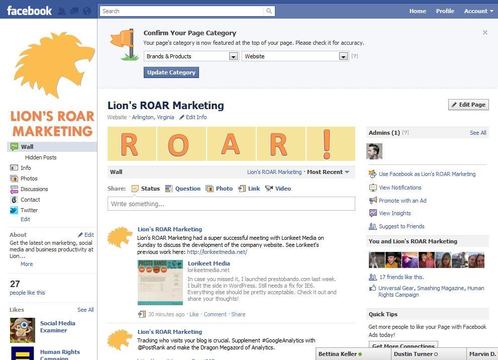 Also, a little update on Lion’s ROAR Marketing Facebook page. Recently, I’ve been chipping away at trying to gather more fans to Like my page.  See previous post here. At the moment I only have 27.  Hey, I don’t call my business a little dog and pony show for nothing. But anyone who reads this could like my page that would be awesome! I would like all the Likes I can get. Also, I’ve tried to take advantage of some the newer features of the Facebook Fan pages like the rotating images on the Wall page and Likes (for other Fan pages), so I can share with everyone all the other great resources I write about.