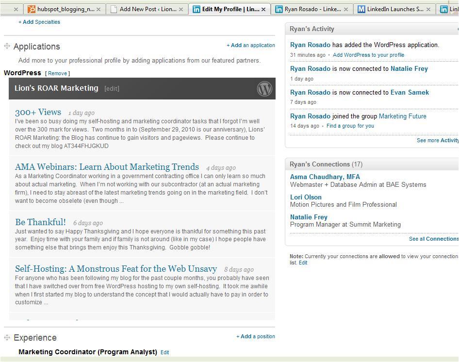 - Applications: I recently stumbled upon this feature which allows you to add cool apps to your profile such as Google Presentations, Polls, Tweets. I just added an app for my WordPress blog, so connections can see my latest posts whenever they look at my profile. See below: