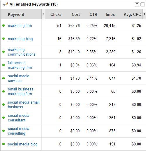 Below are the various keywords I bid on.  Just a bit of advice, “social media” keywords are expensive to bid on and prove to be hard for your blog or website to rise above the other Google Adword Social Media ad clutter.  Focus on uniqueness.