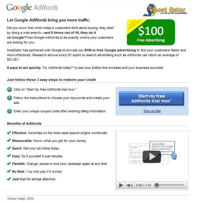 It was a few weeks ago when I came home, checked the mail, and found a letter from my web hosting company HostGator. To my delight, they had sent a letter that contained $100.00 worth of free advertising for Google Adwords. Working on virtually zero marketing budget I was ecstatic that HostGator had presented me with a wonderful opportunity to gain some much needed exposure.