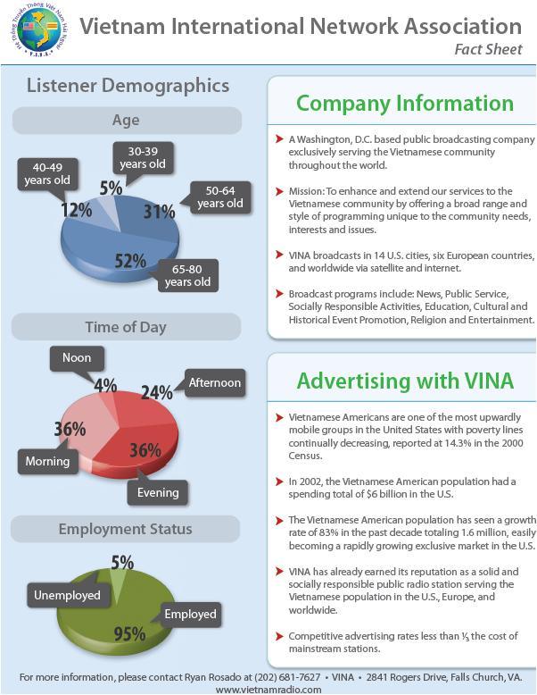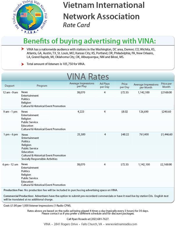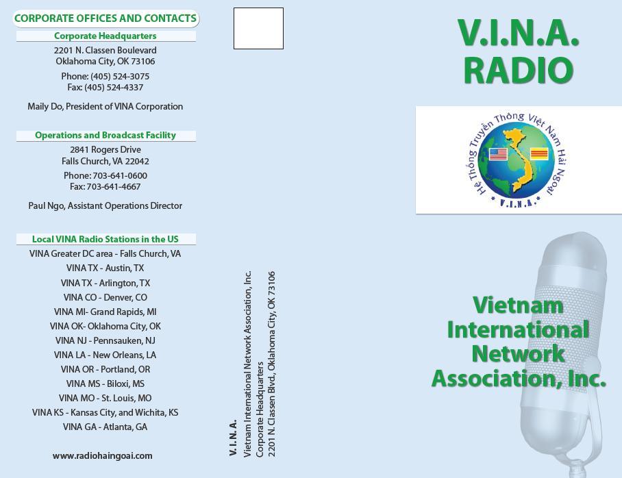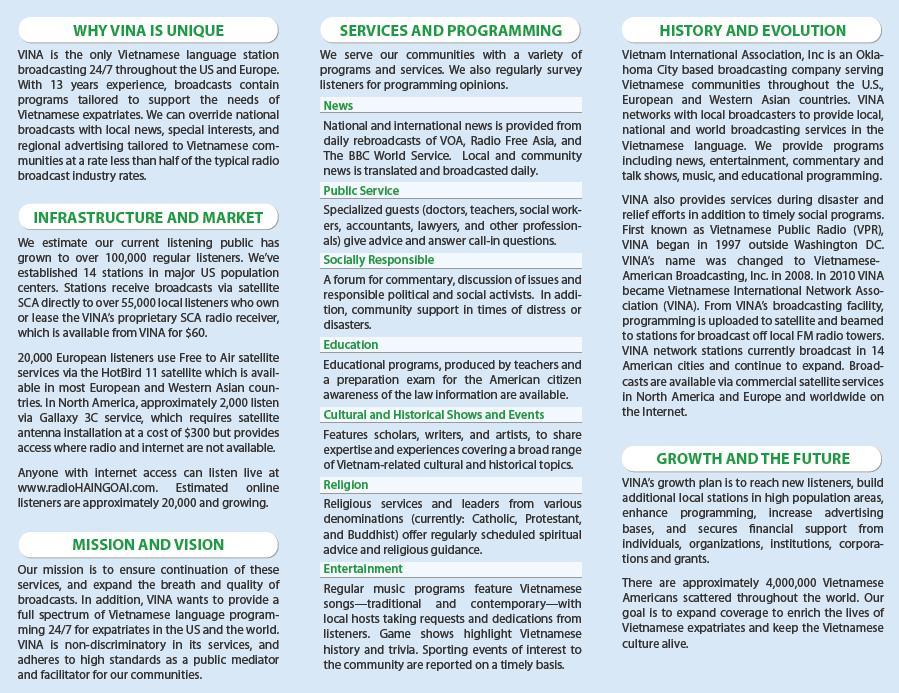 For my first client, Vietnamese International Network Association/Vietnamese Public Radio, I was asked to assemble a media kit for the station and create an advertising program. At the bottom of this post you will find a three-pronged media kit for the station featuring: